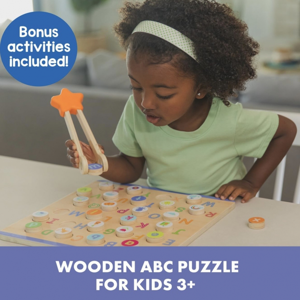 The set includes a wooden alphabet board with recessed spaces, 26 double-sided wooden tokens, and wooden tweezers. Each token is double-sided: