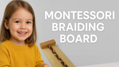 The Montessori Braiding Board introduces children to the coordinated movements required for braiding. Three colored cords are firmly anchored to a hardwood board (30 × 13 × 1.3 cm), allowing children to focus on the crossing sequence without the distraction of loose strings.