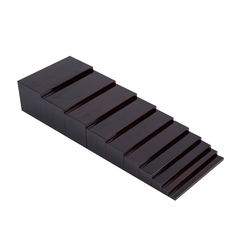 The broad stair (also called Brown Stair) is designed to teach the concepts of "thick" and "thin". It comprises ten sets of wooden prisms with a natural or brown stain finish. When put together from thickest to thinnest, they make an even staircase.