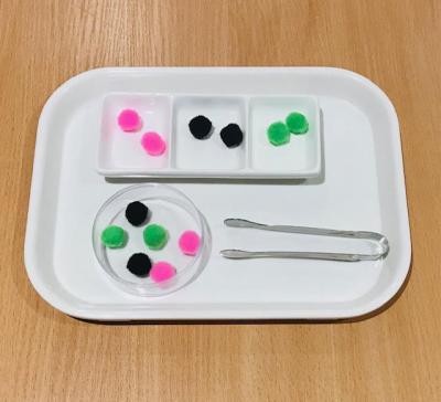 Help children refine their fine motor skills and develop the pincher grip by having them transfer pom-poms with tongs and sort them by colors.