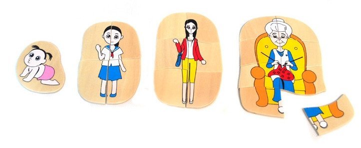 - Includes 4 wooden layers showing a baby, child, young woman, and elderly woman
