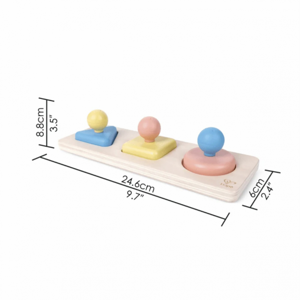 The smooth shapes are designed for small hands and fit into matching cut-outs on the base, encouraging shape sorting, color matching, and hand eye coordination.
