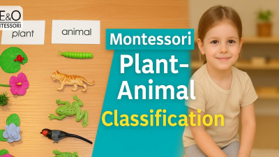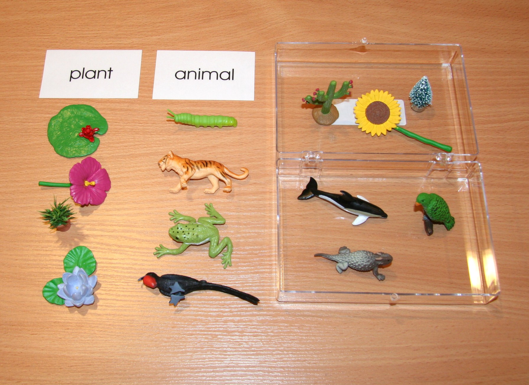 Our beautiful Plant/Animal classification set includes: 6” x 4” x 2” clear plastic box with 14 objects inside, and 2 large cards.