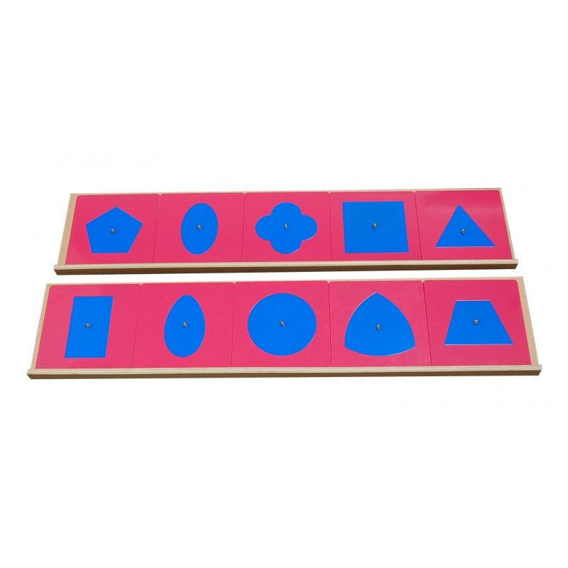 The Montessori Metal Insets are a foundational material in the language curriculum. They prepare the child’s hand for writing by developing control, precision, and confidence through engaging tracing exercises. This complete set includes 10 blue metal geometric shapes in pink frames, with two wooden stands.